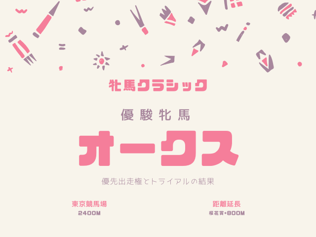 トレンド 【オークス】2026年の優先出走権!トライアル日程と結果!優駿牝馬の賞金ボーダー 2026年度版、オークス(G1・優駿牝馬)の優先出走権と出場条件!オークストライアルの『桜花賞:5着内』と『フローラS:2着内』、『スイートピーS:1着』に優先出走権が与えられます。オークスの出走条件を満たし出走の権利を得る事ができます。トライアルの開催日時や日程、結果、賞金ボーダーを一緒に紹介します 2026.01.25 トレンド