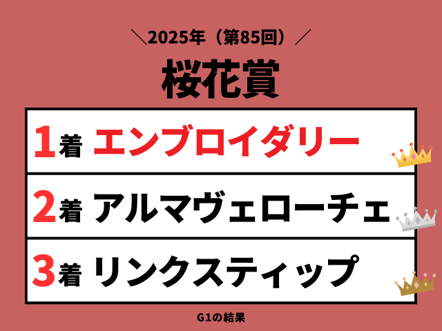 トレンド 【桜花賞】2025年の結果!払い戻しとレース成績!G1掲示板内・配当・着順 第85回、桜花賞(2025年4月13日15:40、阪神1600m)のレース結果。1着:エンブロイダリー(3人5.0倍)、2着:アルマヴェローチェ(2人3.8倍)、3着:リンクスティップ(4人6.8倍)で決着!桜花賞の過去結果(掲示板内、配当、着順)を紹介します 2025.04.13 2025.11.29 トレンド