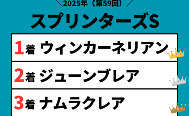 第59回、スプリンターズステークス(2025年9月28日15:40、中山・1200m)のレース結果は『祝!三浦皇成』でした。1着:ウィンカーネリアン(11人50倍)、2着:ジューンブレア(7人20.2倍)、3着:ナムラクレア(2人5.7倍)で決着!スプリンターズSの過去結果(掲示板内、配当、着順)をご紹介します