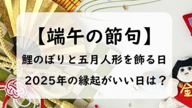 暮らし 【2025年】こどもの日はいつ?五月人形と鯉のぼりはいつ出す?いつからいつまで? こどもの日はいつ?2025年は5月5日の月曜日!五月人形を出すと縁起が良い飾る日、こどもの日の鯉のぼりはいつからいつまで飾るべき?4月6日、4月12日と4月13日が縁起良し。こどもの日は日本でいつから始まった?鯉のぼり、武将の兜、五月人形が始まった時期など!こどもの日に関連する元ネタ、起源となった由来を簡単説明します 2025.02.15 2025.03.25 暮らし