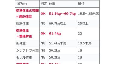 美しく 【167cmの理想体重】167センチの平均体重とシンデレラ体重・モデル美容体重 167cmの女性の理想体重と体型を簡単解説!身長167センチの平均体重は63kg。BMI18・20・22のシンデレラ体重⇒50.2kg、モデル体重⇒50.2kg、美容体重55.8kg、標準体重=普通体重61.4kg。痩せて見える体重とぽっちゃりみえる体重。167cmの50・55・60・65kgの年齢別体重の説明です 2024.01.14 2024.01.16 美しく