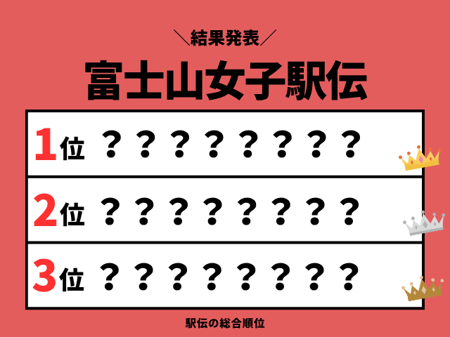 第21回:富士山女子駅伝の結果は?速報の順位は?2026年12月30日開催の富士山女子駅伝の区間記録(1区~7区)と区間賞、タイム、過去の区間賞、歴代の最高記録をご紹介します。総合順位の優勝は-大学(1位:-時間-分-秒)、準優勝:-大学(2位)、3位:-大学の結果でした