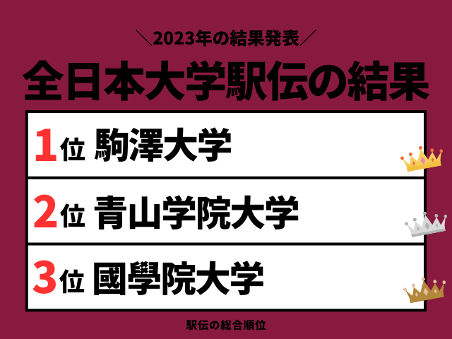 暮らし 【全日本大学駅伝】2023年の結果や順位!速報と区間記録(1区から8区の区間賞) 第55回:全日本大学駅伝の結果は?速報の順位は?2023年11月5日開催の全日本大学駅伝の区間記録(1区~8区)と区間賞、タイム、過去の区間賞、歴代の最高記録をご紹介します。総合順位の優勝は駒澤大学(1位:5:09:00)、準優勝:青山学院大学(2位)、3位:國學院大学の結果でした 2025.10.15 2025.12.20 暮らし