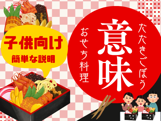 おせち料理の『たたきごぼう』の意味や由来を一般的な解釈と子供向けに、わかりやすい説明をします。たたきごぼうとは、身を開いて作る事から『開運の縁起』や姿かたち、地中に根を張る様子から『長寿』の意味がありますが、小学生になら『家族みんなで仲良く』と拡大解釈した方が理解しやすい内容になります