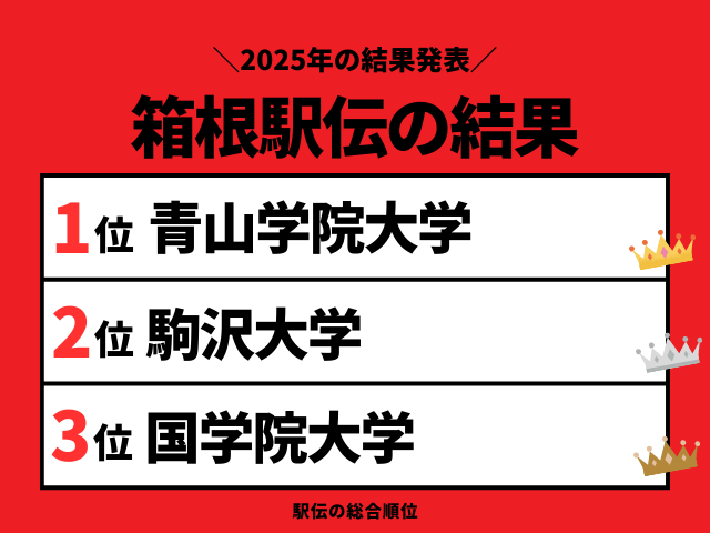 第101回:箱根駅伝の結果は?速報の順位は?2025年1月2日開催の箱根駅伝:往路の区間記録(1区~5区)と区間賞、タイム、過去の区間賞や歴代の最高記録をご紹介します。東京箱根間往復大学駅伝競走の総合順位は青山学院大学(1位)、中央大学(2位)、早稲田大学(3位)の結果でした