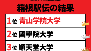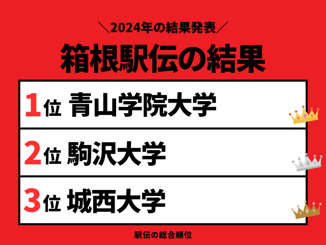 第100回:箱根駅伝の結果は?速報の順位は?2024年1月2、3日開催の箱根駅伝の区間記録(1区~10区)と区間賞、タイム、過去の区間賞や歴代の最高記録をご紹介します。総合順位の優勝は青山学院大学(1位:総合記録10:41:25)、準優勝:駒澤大学(2位)、3位:城西大学の結果でした