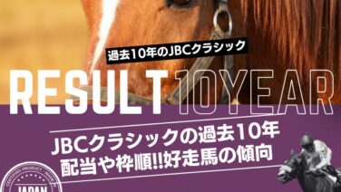 過去10年、JBCクラシックの払戻金の配当はいくら?予想の為の前走ローテと着順成績(タイム差)、枠順とコーナー通過順位、脚質、当日人気や馬体重等の傾向データを10年分を一覧にまとめました。JBCクラシック予想の本命・対抗の優劣、取捨に悩む時の消去法に役に立つ情報になります