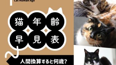 猫の年齢を人間換算した猫年齢早見表を作成しました。1~10歳、平均寿命の15~16歳、20年以上生きた猫は人間の場合は何歳くらい?計算式(24+(年齢-2)×4)に基づき、猫⇔人間の年齢変換を確認できます。猫は3カ月が人間の1年、6カ月は2年に相当します