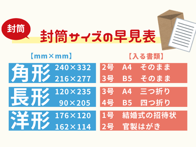 学ぶ 【封筒サイズの早見表】角形・長形・洋形の一覧(号別:定形や定形外・規格内) 封筒サイズを角形、長形、洋形の全種類を早見表にしました。角形封筒A4号は『228×312mmの定型外、規格内』のように『角形0号から8号』を一覧で確認できます。長形1~4号、長形30・40号。定型内の洋形0~7号のサイズ表があります。各封筒を折らずに入る用紙(A4、B5等)、三つ折りや四つ折りの入れ方もわかります 2025.12.09 学ぶ
