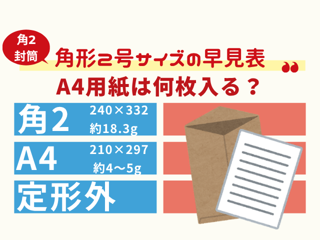 学ぶ 【角2封筒】A4サイズの書類は何枚まで郵送できる?定形外50g・100g以内用 角形2号(角2封筒)はA4サイズの書類を何枚まで郵送できる?クリアファイルも入る大きさです。定形外郵便の50g以内なら茶封筒(約18.3g)や白い封筒、A4用紙7枚(4g×7枚)です。未晒クラフト紙(約17.7g)なら8枚が目安になります。クリアファイルの重さは約22~26gの為、12枚程度が100g以内になります 2025.12.06 学ぶ