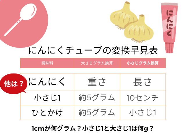 ご飯 【にんにくチューブ】1cmが何グラム?小さじ1と大さじ1は何g?グラム計量早見表 にんにくチューブは1cmが何g?にんにくチューブのグラム数を『小さじ1、大さじ1』や『ひとかけ分』に換算した計量早見表にまとめました。にんにくチューブは小さじ1が4.5g(10cm)、大さじ1は13g(約29cm)に相当します。にんにく:ひとかけ分は小さじ約1杯、目安は500円玉サイズの1個程になります 2025.12.07 2025.12.14 ご飯