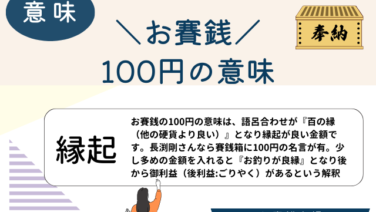 マネー 【お賽銭】100円の意味は百の縁!長渕剛風なら賽銭箱に100円が御利益(後利益) お賽銭の100円の意味は、語呂合わせが『百の縁(他の硬貨より100倍良い)』となり縁起が良い金額です。ミュージシャンの長渕剛さんなら賽銭箱に100円の名言が有。少し多めの金額を入れると『お釣りが良縁』となり後から御利益(後利益:ごりやく)があるという珍しい解釈もあります 2026.01.02 マネー