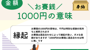 マネー 【お賽銭】1000円の意味は?千円は特別な感謝の気持ち(語呂合わせはなし) お賽銭の1000円の意味は、千円は特別な感謝の気持ちと解釈されます。お賽銭は語呂合わせによって縁起が良い、ダメな金額がありますが『1000円のお賽銭に語呂合わせは特に無』です。そのまま千円をお賽銭箱に入れる方法もありますが、無地のお賽銭袋にいれて御初穂料と記載。この方法が一般的です 2025.12.31 2026.01.01 マネー
