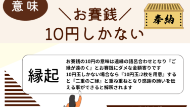 マネー 【お賽銭】10円の意味は?縁起は遠縁!10円玉しかない場合の対処法 お賽銭の10円の意味は遠縁の語呂合わせとなり『ご縁が遠のく』を連想します。どちらかと言えば、お賽銭にダメな金額寄りです。10円玉しかない場合なら『10円玉:2枚を用意』すると『二重のご縁』と重ね重ねとなり感謝の願いを伝える事ができると解釈されます 2026.01.01 マネー