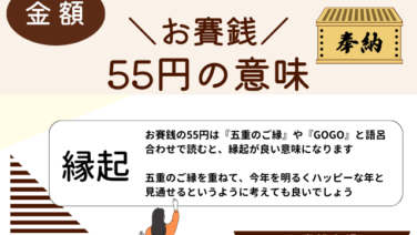 マネー 【お賽銭】55円の意味や縁起は?五十五を『いそいつ』と読むと身近なご縁や五重の縁 お賽銭の55円は『五重のご縁』や『GOGO』と語呂合わせで読む事ができる為、縁起が良い意味になります。漢字の五十五を『いそいつ』と読むと『そいつ=身近な人』となり、神社とご縁があると解釈されます。全てを組み合わせると『いつでも前向きな姿勢』を印象する数字です。また、穴の開いた五円玉は先の見通しが良しともとらえられます 2025.12.31 2026.01.01 マネー