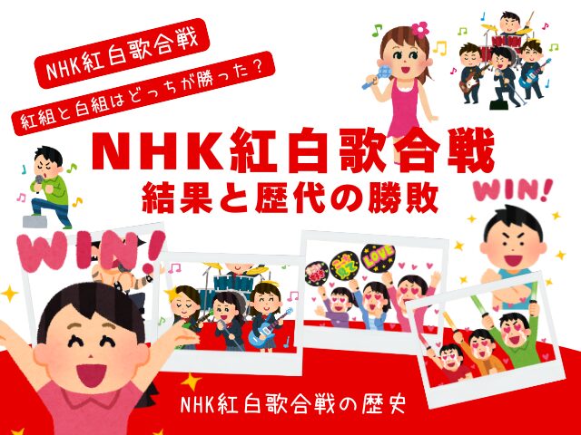 2025年の紅白歌合戦の結果!紅組と白組はどっちが勝った?最新と歴代のNHK紅白歌合戦の勝敗を昭和・平成・令和時代:1926年(第1回目)からの結果をご紹介します。勝敗の内訳(審査員・会場審査員・視聴者審査員の得点)を確認できます